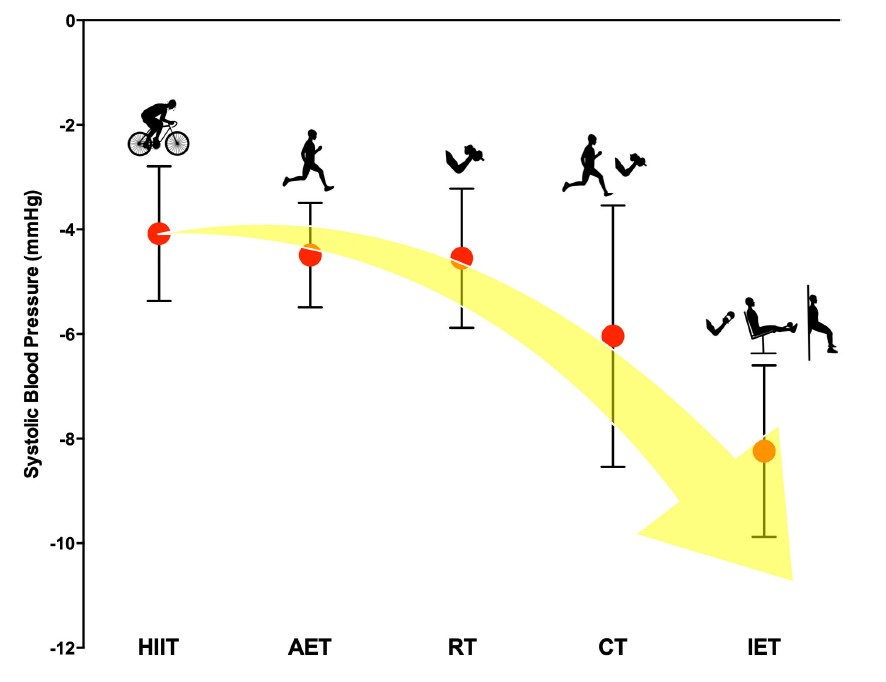 2023년 7월 25일 영국의 연구진들에 의해 발표된 연구 [2] 가 이러한 운동 방식들을 모두 고려하여 고혈압 증상을 개선하기에 가장 좋은 운동 방식을 찾아 내었습니다. 이 연구에서는 다음의 운동 방식들을 고려하였습니다.